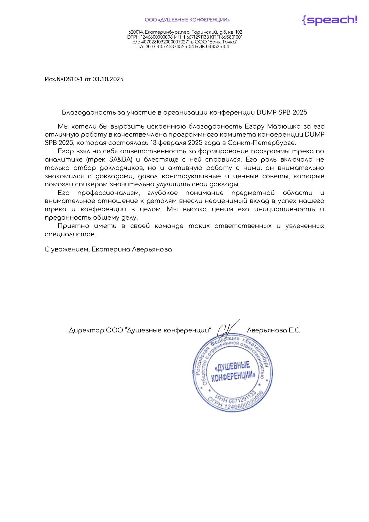 Нам пришло благодарственное письмо от организаторов конференции DUMP SPB 2025!